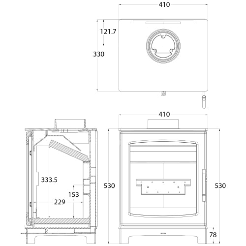 and cast iron door The firebox is lined with 30mm vermiculite panels. Polished