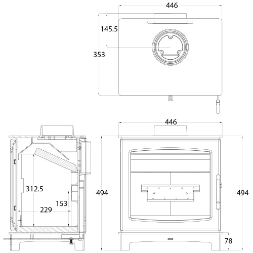 and cast iron door The firebox is lined with 30mm vermiculite panels. Polished