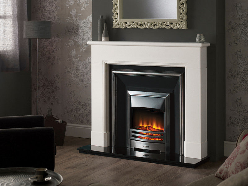 A contemporary, imposing mantel with a delicate rounded shelf profile and elegant solid footblocks. The Hanwell’s rectangular feature blends the fire (log effect) perfectly here with the Oxford highlight fascia and SLE40i inset electric fire and Mizar polished fireframe.