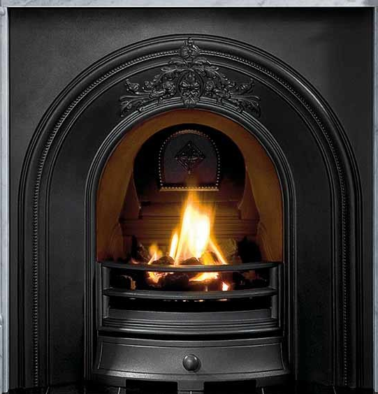 Our most decorative arched cast is the Landsdowne arch fireplace with the large motif at the top of the cast it is a feature that stands out and makes it very traditional in design, the black finish is traditional too a black leaded type look.