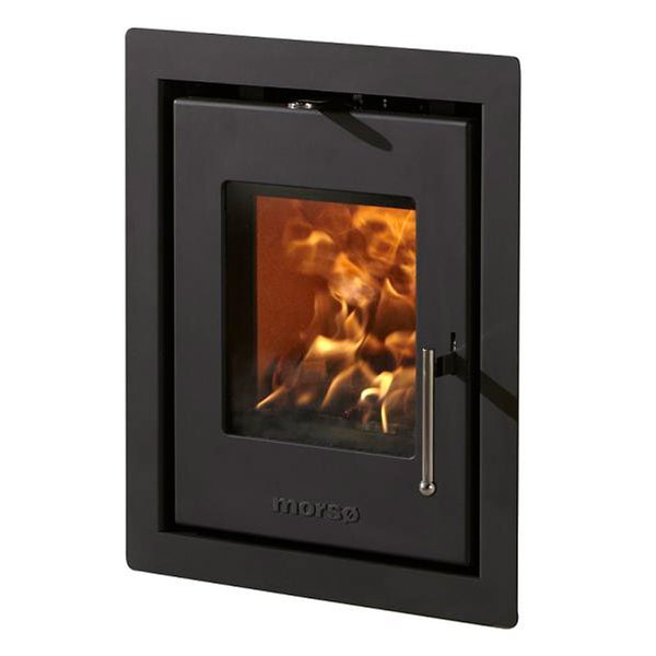 The stove door is in the well known Morsø quality cast iron, while the surrounding frame is available in dark anthracite grey or brushed steel.