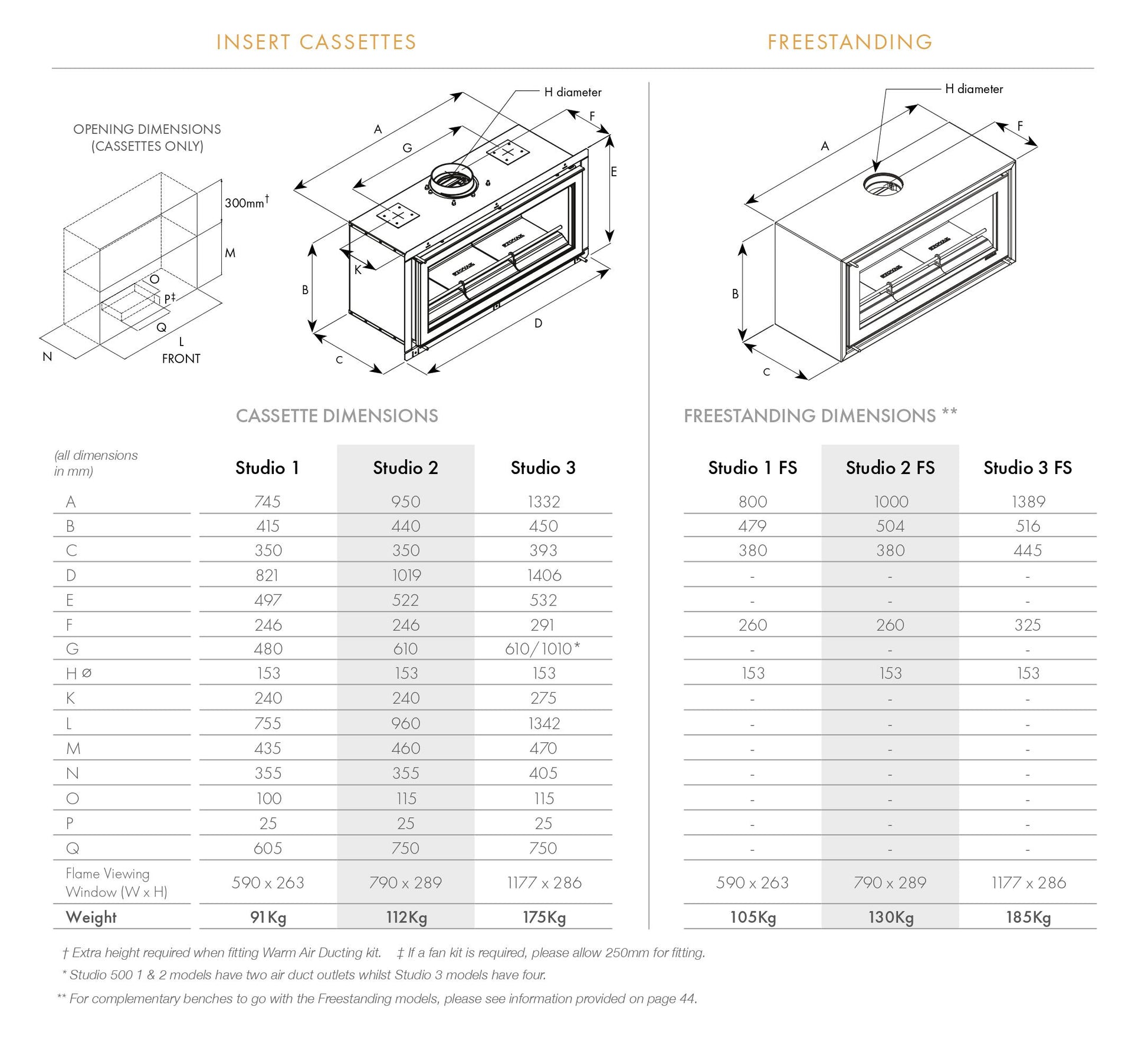 Studios come in two formats: insert (cassette) fires with an array of styling options, or bold, freestanding fire versions. Both offer a choice of size options to suit your requirements.