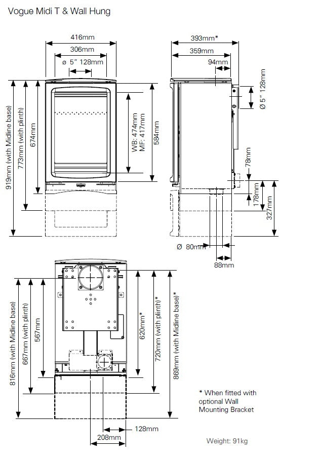 The Stovax Vogue Midi T is a taller version of the Vogue Midi wood burning stove, offering the same ultra cleanburn capability of the Midi, but featuring a more portrait firebox. Displaying superb visuals through the large stove window, the powerful Airwash system ensures the flames can always be appreciated. The Midi T can be installed with the Midline log store base for convenient fuel storage and increased height.